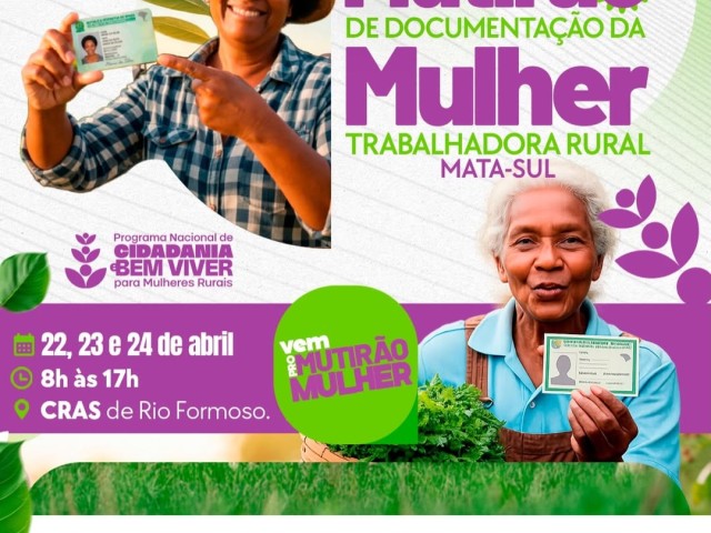 A Prefeitura de Rio Formoso convida todas as mulheres trabalhadoras rurais para participarem do Mutirão de Documentação, que acontecerá nos dias 22, 23 e 24 de abril, das 8h às 17h, no CRAS do município.
